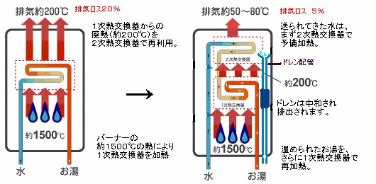 潜熱回収型の高効率給湯器は、従来型の給湯器では捨てられていた約200〜230℃の排気の熱を利用して、二次熱交換器で水を温めます。このあらかじめ暖められた水を一次熱交換器で加熱し、お湯をつくりますので、エネルギーが抑えられ、省エネ・ガス代の節約にもつながります。